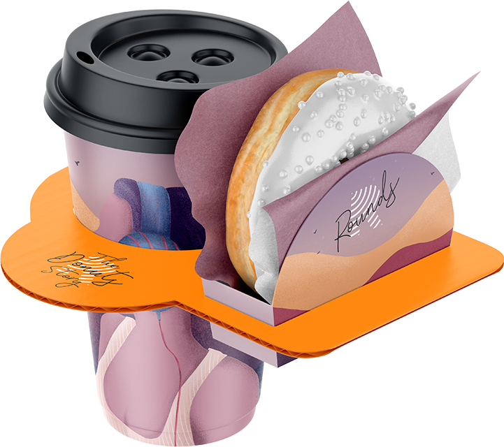 A cup holder with a hole to place the donuts in it to make the carrying the drink easier and fun.